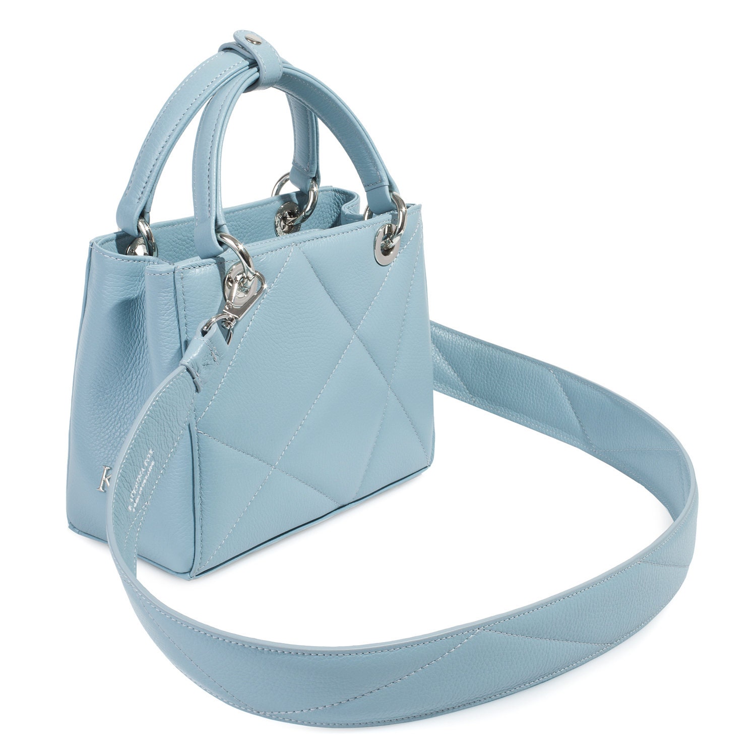 Blue genuine leather handbag from ukrainian designer Katerina Fox. The internal space of a bag is equipped with three spacious compartments and two patch-pockets and one zipper pocket. One of the spacious compartments is closed with a zipper. The bag is closed with a clasp. The bottom of the bag is protected with metal legs. There is a long handle that allows you to wear the bag on the shoulder. The kit also includes a storage bag.