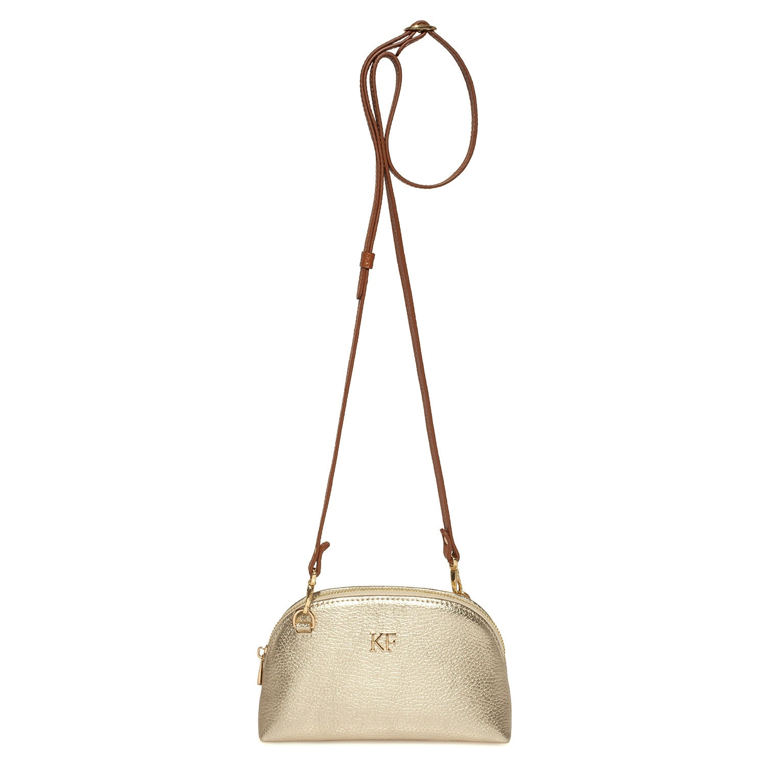 Gold genuine leather woman crossbody bag from ukrainian designer Katerina Fox. Fashionable and elegant modern bag KF for bright girls and women. This bag is able to attract attention and highlight your exquisite taste. The internal space of a cosmetic bag is equipped with one spacious compartment and one patch-pocket. The bag is closed with a zipper. The kit also includes a storage bag. The kit also includes a storage bag.