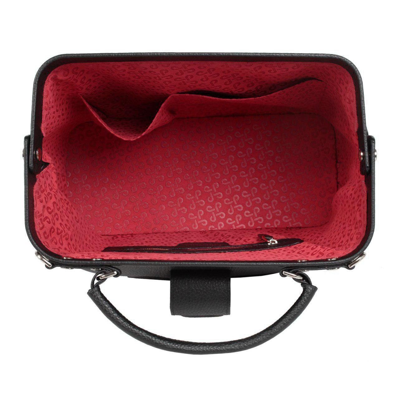 Black genuine leather handbag from ukrainian designer Katerina Fox. This model is designed for women who appreciate the sleek design combined with functionality and comfort. High-quality and reliable hardware ensure long service bags. The internal space of a bag is equipped with one spacious compartment and two patch-pockets and one zipper pocket. The bag is closed with a clasp. The bottom of the bag is protected with metal legs. There is a long handle that allows you to wear the bag on the shoulder. The kit also includes a storage bag.