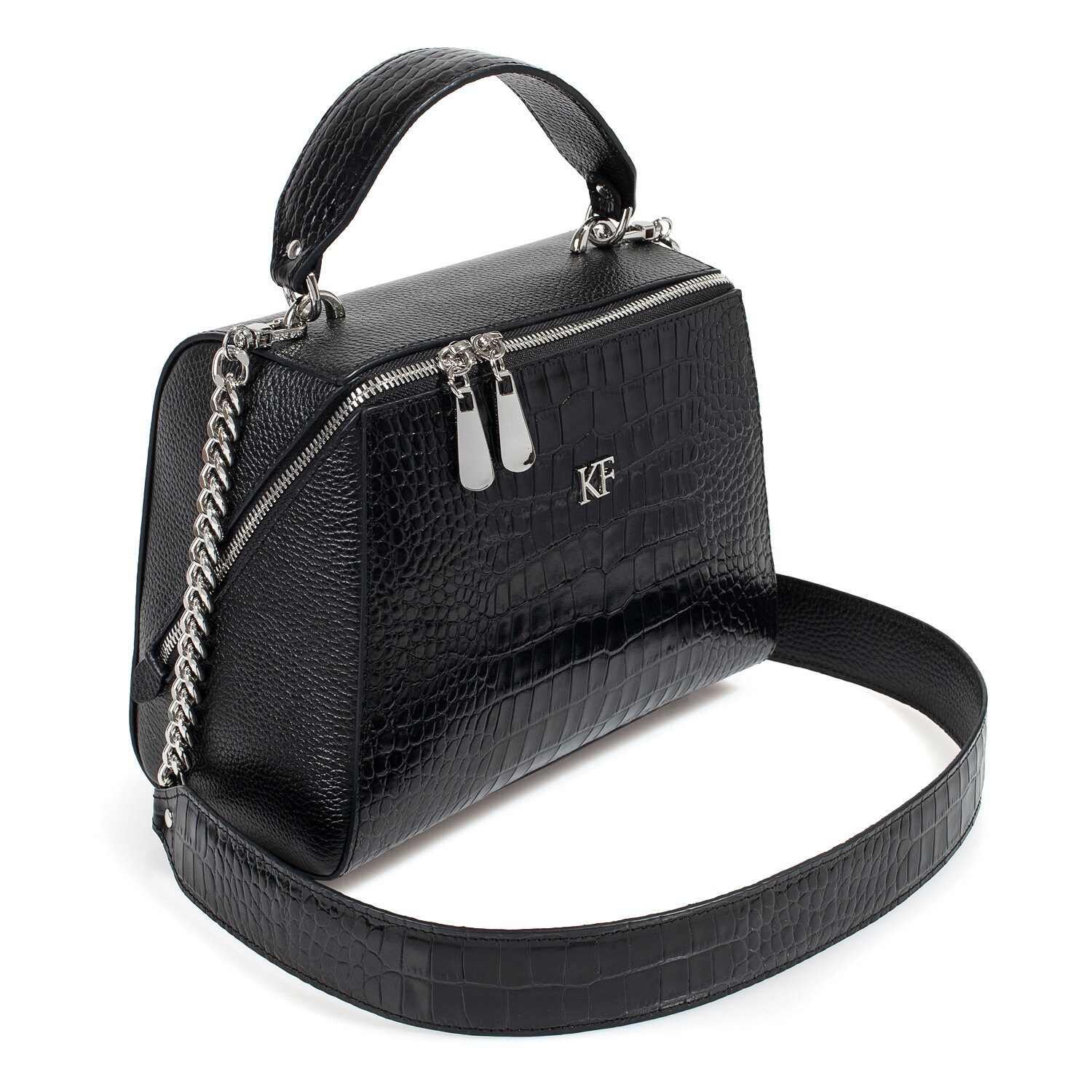 Black genuine leather handbag from ukrainian designer Katerina Fox. This model is designed for women who appreciate the sleek design combined with functionality and comfort. High-quality and reliable hardware ensure long service bags. The internal space of a bag is equipped with one spacious compartment and two patch-pockets and one zipper pocket. The bag is closed with a zipper. The bottom of the bag is protected with metal legs. There is a long handle that allows you to wear the bag on the shoulder. The kit also includes a storage bag.