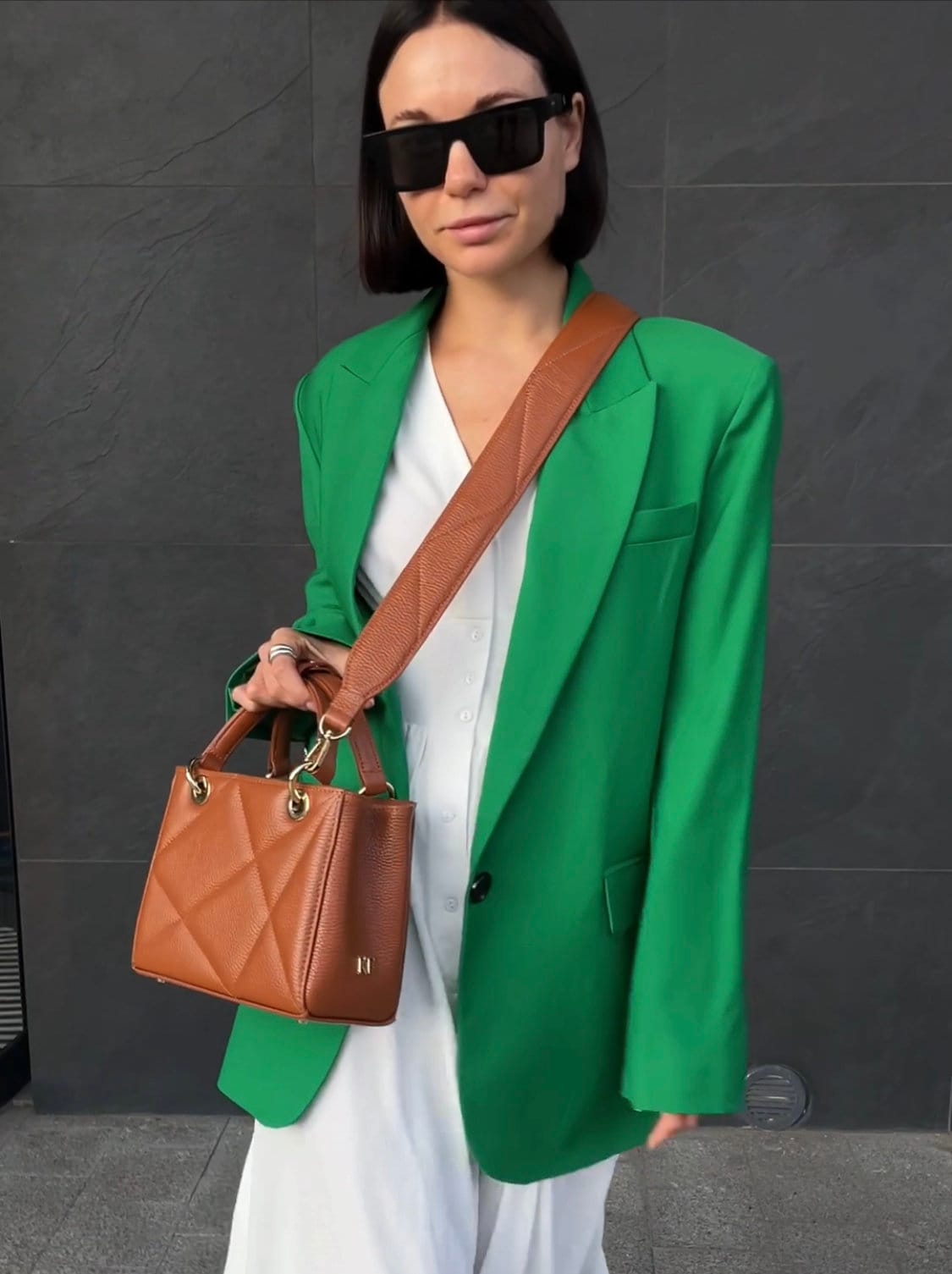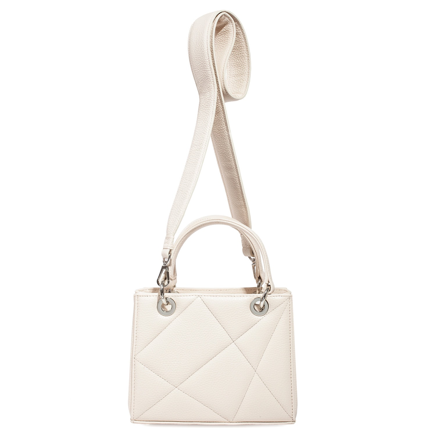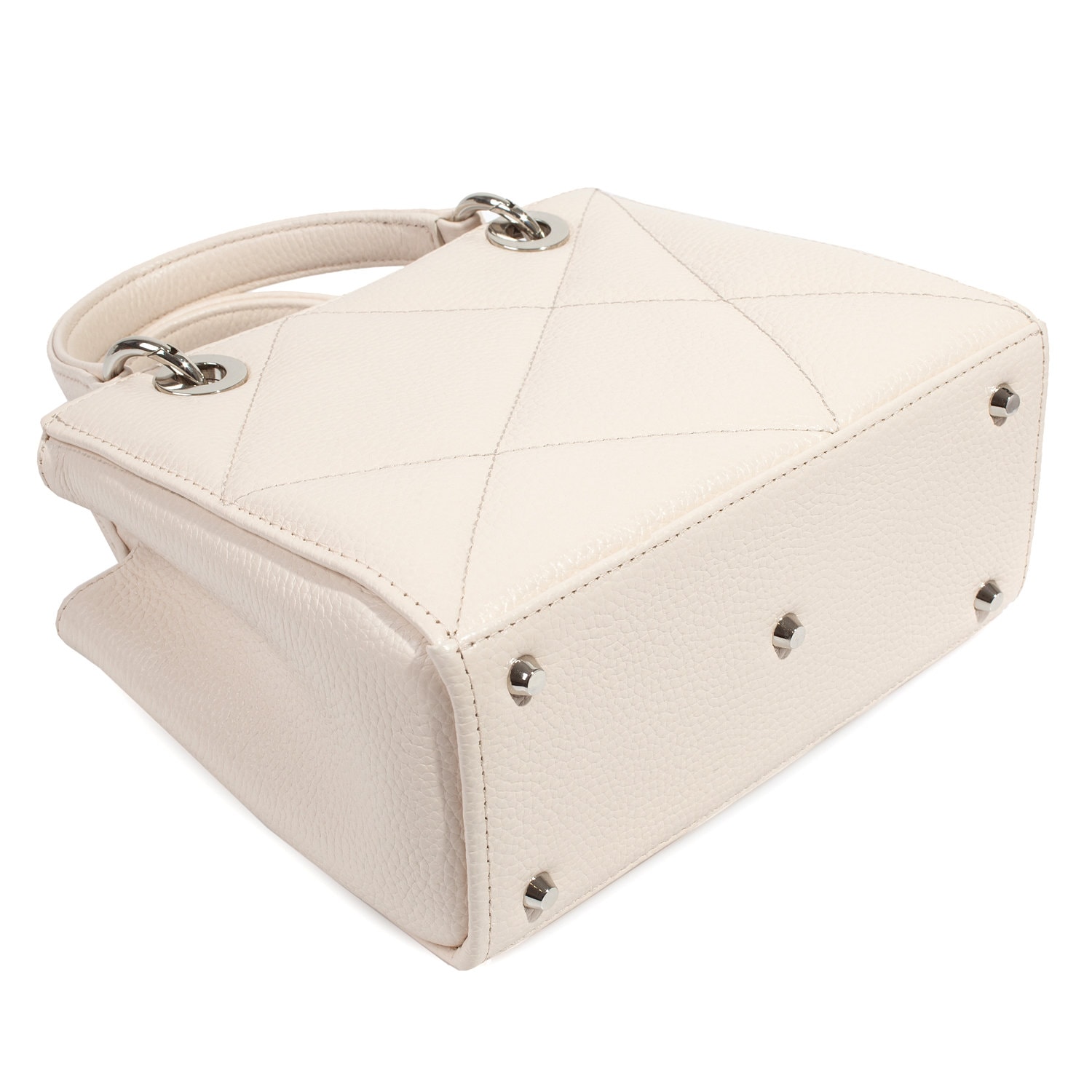 Women's leather bag made of genuine leather, hardware with galvanic coating and microfiber lining. The internal space of a bag is equipped with three spacious compartments and two patch-pockets and one zipper pocket. Closes with 2 buttons magnet. The bottom of the bag is protected with metal legs. The kit also includes a storage bag.